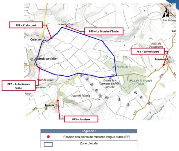Dans le cadre de cette étude, 5 sonomètres ont été installés de façon à mesurer l'ambiance sonore du site en l'absence d'éoliennes. Les mesures pour le projet éolien des Rapailles ont été réalisées à l'automne. Cette période peut être assimilée à une situation acoustiquement intermédiaire entre les saisons hivernales et estivales, notamment pour ce qui est de la densité de la flore et des activités de la faune et humaines.