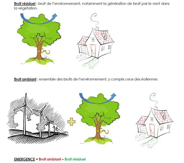 Sur la base des mesures du bruit résiduel et des calculs de la contribution des éoliennes, on peut estimer l’émergence du projet au droit des habitations riveraines :